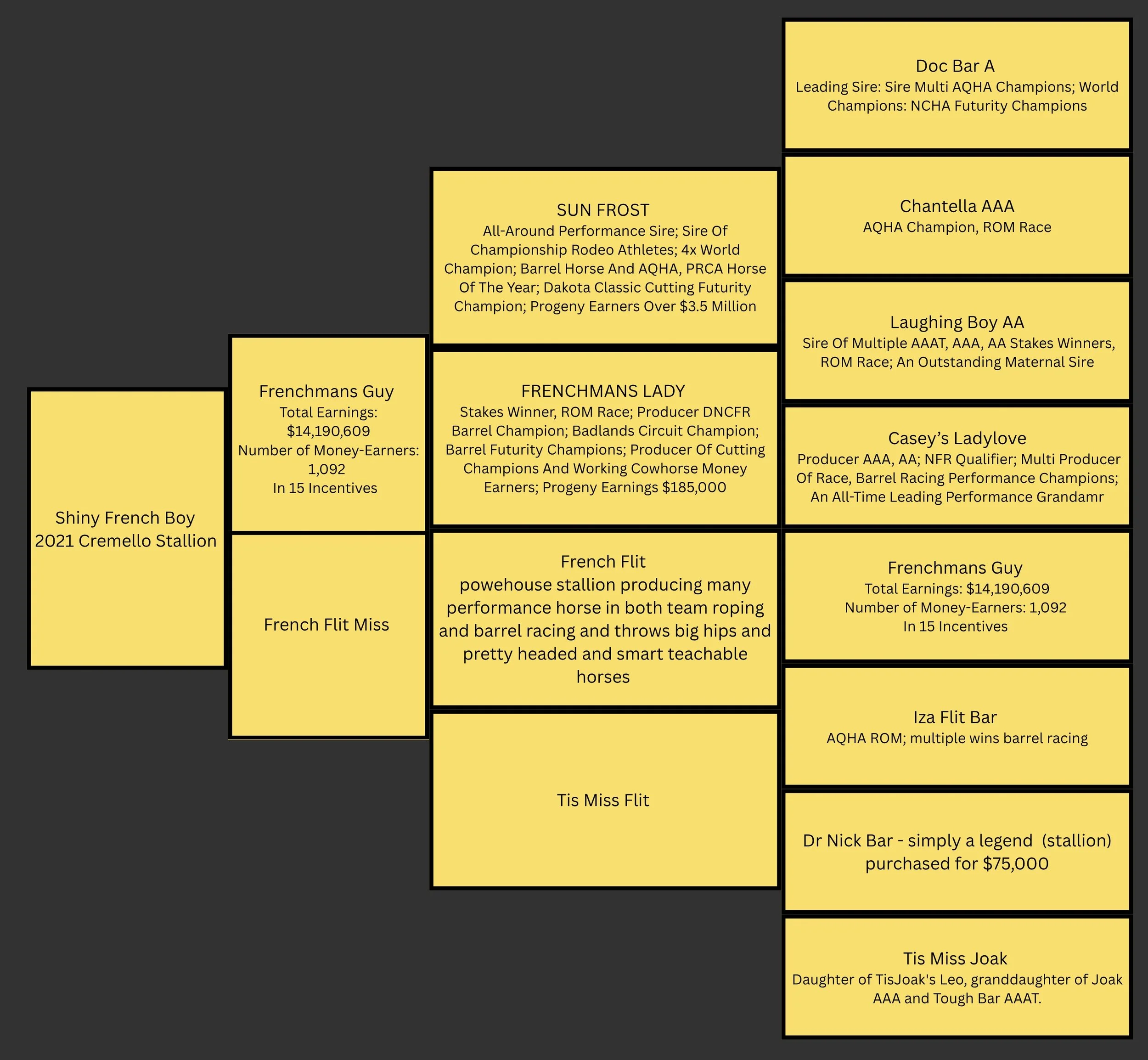 Shiny French Boy is a own some of the legendary Frenchman’s Guy with foal earning over 20 million, his foals excel in any part of the performance horse industry with dame side going back to frenchman guy with tons of performance winners all over the dame side, Shiny French Boy has a beautiful head and big hope, and all the talent in the world with long side and smart and willingness to learn and please this young stallion will go far in his career you will want to keep an eye on him, and he has the best disposition anyone can ask for the kind everyone hopes a stallion throws into there offspring.